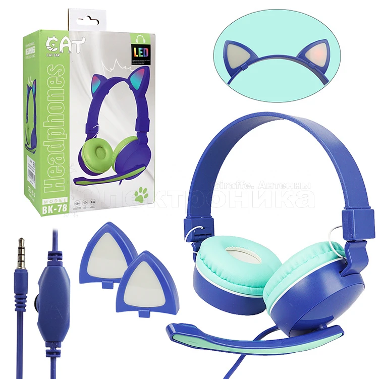 наушники большие cat bk-78 сине-зеленые, проводные с микрофоном, кошачьи ушки (aux) регул. громкости  фото